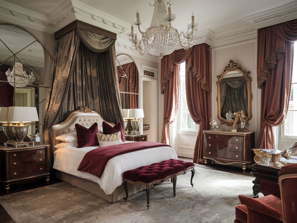 - Charakterystyczne elementy to baldachimy, kanopy, zasłony z ciężkich tkanin i bogato zdobione ramy obrazów